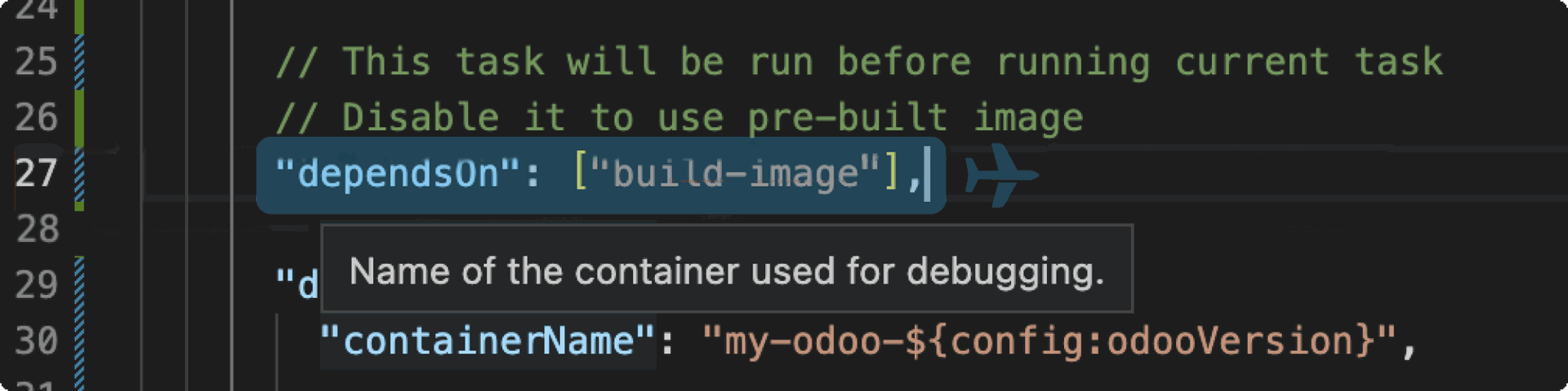 In case you are working on multiple projects for the same Odoo version you might benefit from building an image before using it in IDE. It will skip the build step in the tasks.json and will make the debugging process faster.